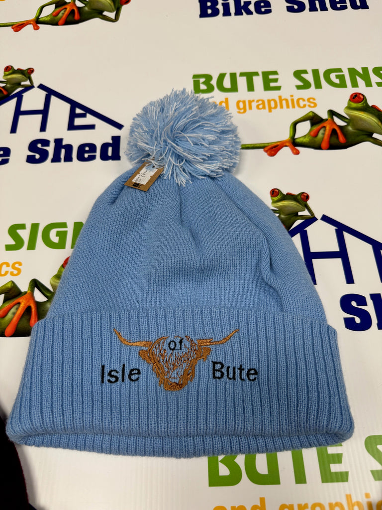 We have added our Isle of Bute Highland cow logo to our popular PomPom beanie. Features of this hat include